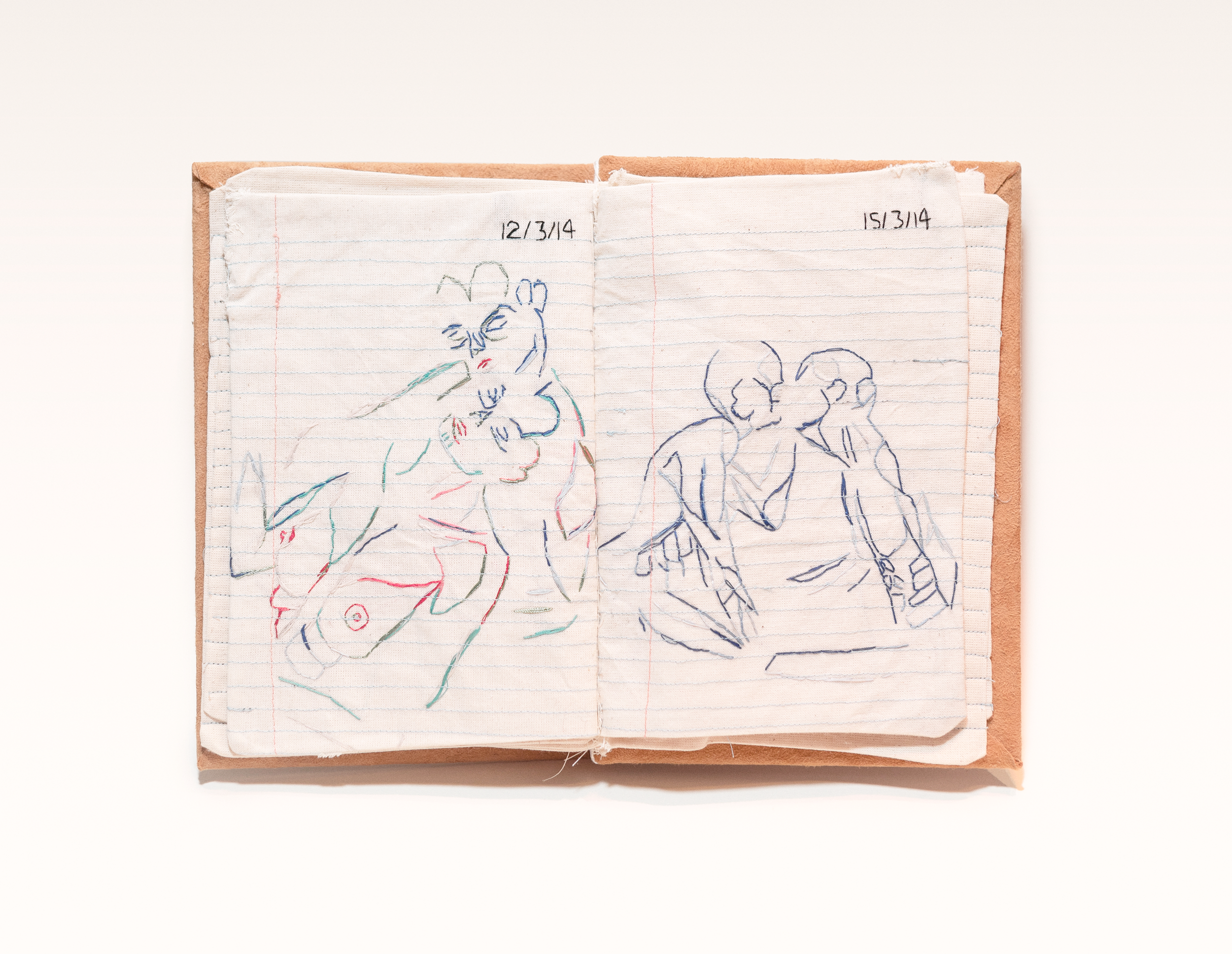 Embroidered thread on calico, leather binding 21.5 x 31.5 cm